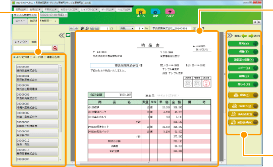 作成したい伝票のレイアウトイメージを選択したり、台帳に登録済みの得意先や商品情報を呼び出すことが出来ます。